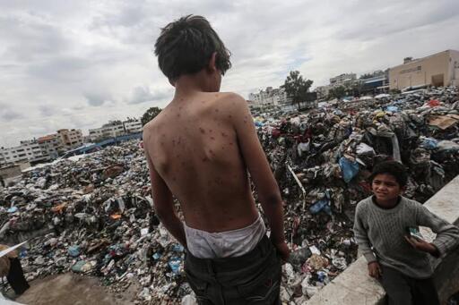 Displaced children living in a camp set up next to a landfill in the Yarmouk area of Gaza City on 22 March.