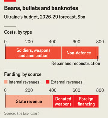 The Economist reports that Ukraine will need about $389 billion in cash and weapons from 2026 to 2029 to keep going