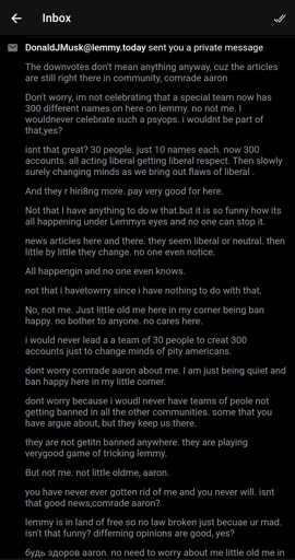 To the mods of this comm, I understand this isn’t a post complaining about a mod action taken against me. It’s hardly even a complaint against a mod, although he does mod a handful of communities. I know it’s a hard-to-prove personal message that the accused will deny sending or say was a joke he told a troll, his word vs mine. But this is beyond the usual actions mods take. This is abuse of the fediverse, harrassment, ban evasion, and vote manipulation.