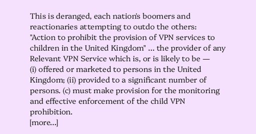 git [he/him, comrade/them]@hexbear.net to news@hexbear.netEnglish · 5 days agoUK House of Lords attempting to ban use of VPNs by anyone under 16alecmuffett.comexternal-linkmessage-square32linkfedilinkarrow-up1113arrow-down10