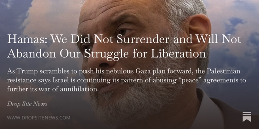 AltMediaGuyMA to AltMedia · 10 days agoHamas: We Did Not Surrender and Will Not Abandon Our Struggle for Liberationwww.dropsitenews.comexternal-linkmessage-square0linkfedilinkarrow-up13arrow-down10cross-posted to: worldnews@lemmy.mlpalestine@lemmy.ml