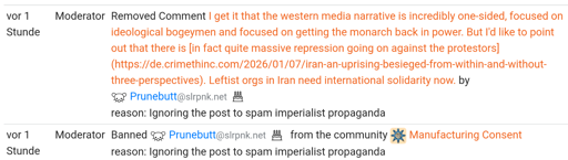 @geneva_convenience@lemmy.ml banned me from !ManufacturingConsent@lemmy.ml (permanently!) and removed my comment from the post, because I dared to note that there are protests in Iran and shared a link to a crimethinc article with voices from within Iran. They call it “imperialist propaganda” if leftist voices from within Iran are distributed.