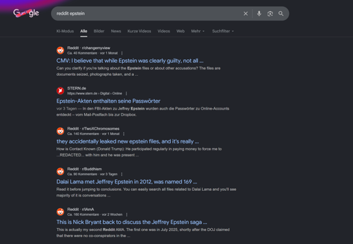 Wegwerf11@lemmy.world to The Epstein Files@lemmy.worldEnglish · 3 days agoGoogle and Reddit both suppress news about Epsteinlemmy.worldimagemessage-square9linkfedilinkarrow-up1120arrow-down11