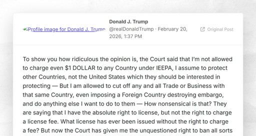 To show you how ridiculous the opinion is, the Court said that I’m not allowed to charge even $1 DOLLAR to any Country under IEEPA, I assume to protect other Countries, not the United States which they should be interested in protecting — But I am allowed to cut off any and all Trade or Business with that same Country, even imposing a Foreign Country destroying embargo, and do anything else I want to do to them — How nonsensical is that? They are saying that I have the absolute right to license, but not the right to charge a license fee. What license has ever been issued without the right to charge a fee? But now the Court has given me the unquestioned right to ban all sorts of things from coming into our Country, a much more powerful Right than many people thought we had.