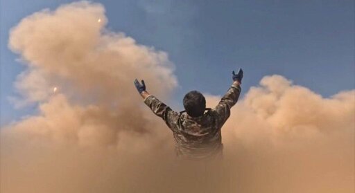 Image is of an Iranian soldier exulting in the launch of a ballistic missile aimed towards the imperialists.