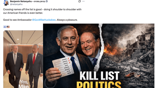 arrow-up114arrow-down1external-linkSmiling Over Death: Netanyahu Flaunts ‘Kill List’ as Huckabee Laughs Alongscheerpost.comAltMediaGuyMA to AltMedia · 7 hours agomessage-square1linkfedilink