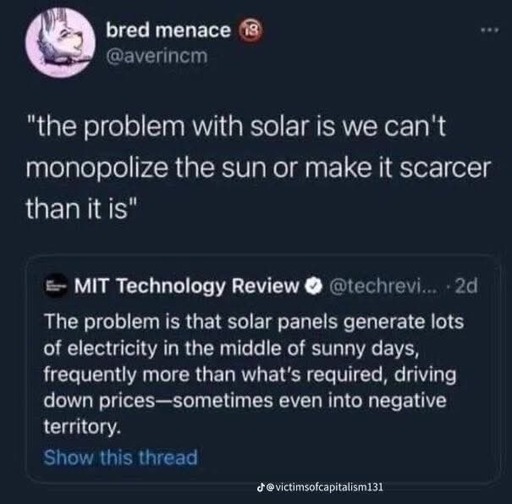 This gets posted regularly on Lemmy, and while the economic take is tone-deaf at best, there’s a real issue with generating more power than you can use. You can’t just dump grid power — it needs to go somewhere. The grid needs to consume as much as it generates at all times or else bad things happen.