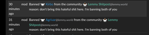 I don’t care if I am banned or not even though I did not do anything wrong - I mostly lurk on here, but Agrivar@lemmy.world should not be welcome in the fediverse, and the fact that they are only banned from 1 community is completely fucking inexcusable. kill all Nazis
