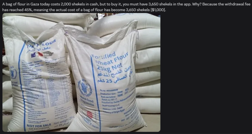 arrow-up15arrow-down1imageTIL a single 25kg bag of flour now costs $1000 in Gaza.lemmy.mlcm0002@lemmy.world to Palestine@sopuli.xyz · 8 months agomessage-square0linkfedilinkcross-posted to: palestine@lemmy.ml
