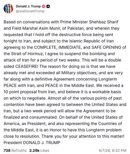 🚨 US PRESIDENT TRUMP: “I agree to suspend the bombing and attack of Iran for a period of two weeks” – a “double sided CEASEFIRE.”