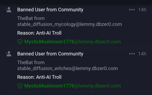 I downvoted pro-AI comments in a post in leftymemes community. It was LLM generated polandball comic (Which is objectively pathetic as fuck) that showed up on my feed, blocked couple of users who I thought were unhinged, and have blocked the whole instance on my client after realizing how rabid these morons are.