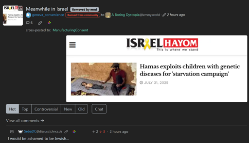 So far I have been banned from /microblogmemes for posting criticism of Israel and /aboringdystopia for reporting antisemitism. What an amazing server.
