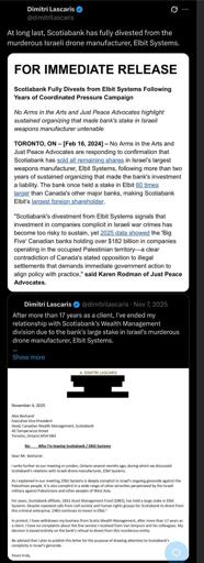 arrow-up126arrow-down1image🇨🇦 At long last, #Scotiabank has fully divested from the murderous #Israeli #drone manufacturer, #ElbitSystemsplus-squarelemmy.mlWhatWeGon' DoLuv?@zirk.us to Palestine@lemmy.ml · edit-21 month agomessage-square0linkfedilink